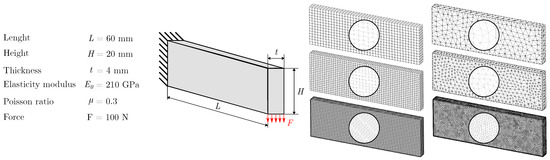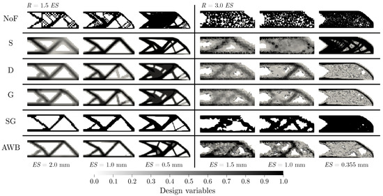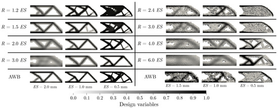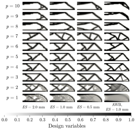 In this paper, the density-based method used the Solid Isotropic Material with Penalty (SIMP) material model, which is a power-law relation of the design variables. The SIMP material model is used in solvers such as ANSYS (ANSYS, Inc., Canonsburg, PA, USA), MSC Nastran (MSC Software, Irvine, CA, USA), etc. The elastic modulus of the element is defined as