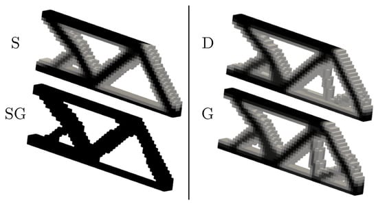 The objective of the optimization presented in this paper is to minimize compliance arising during volume reduction defined as volume fraction . The volume fraction is calculated as the ratio of the proposed volume and the original volume. The volume fraction ranges from 0% to 100%.