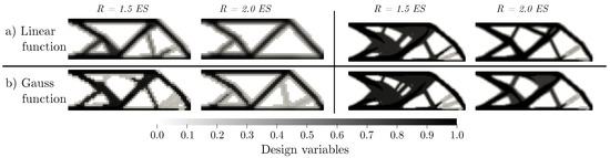 Results of optimization for various filters for each mesh, dependent radius, filter radius of linear HEX mesh is R = 1.5 an filter radius of linear TET mesh is R = 3.0 .