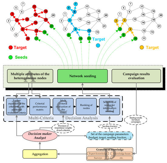 To better address the aforementioned needs, the authors’ main contribution in this paper is to provide an approach in which multi-attribute targeted groups of users can be reached in social networks by providing the initial seeding information to a limited number of selected network users. In the proposed approach, contrary to other studies, the selection of the seeded nodes of the social network is based on multiple, often conflicting, criteria and nodes’ attributes. Moreover, by virtue of the MCDA (Multi-Criteria Decision Analysis) foundations of the proposed approach, the importance of each criterion considered in the selection process can be adjusted to meet the marketer’s needs. MCDA tools, such as sensitivity analysis [12], also allow us to further study and understand the effect each seeded nodes’ attribute has on the planned viral marketing campaign’s capacity to reach the targeted group of the network nodes [13]. Some symmetric characteristics of the proposed approach are assumed—whilst the global coverage in the network can decrease, the proposed approach strives to maximize coverage amongst the targeted nodes.