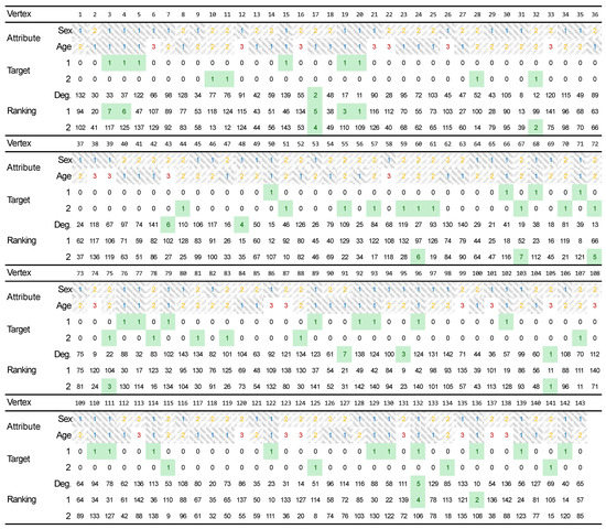 In this scenario, the aim of the viral marketing campaign is to reach men aged 0–29, that is, the targets are described by specific values of two criteria: gender (C2) and age (C5). The target group, therefore, consists of 28 nodes (see Figure 2). Apart from the two target-describing attributes, some other criteria are also available: degree (C1), degree male (C3), degree female (C4), degree aged 0–29 (C6), degree aged 30–59 (C7), degree aged 60+ (C8). The decision maker (DM)/analyst, based on their expertise, provide the preference weights for all criteria: C1: 8.20, C2: 25.40, C3: 12.60, C4: 3.80, C5: 28.40, C6: 14, C7: 3.80, C8: 3.80. These weights are provided by the DM as input data to the proposed approach, as the ones which, according to the DM, allow to rank the nodes in order to find the seeds potentially best for maximizing influence in the targeted group. In order to provide such weights, the analyst can refer to archival knowledge and use decision support systems or MCDA methods such as AHP [39].