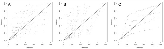Visual comparison of ranks of nodes obtained in rankings for various scenarios: (A) scenarios 1 and 2; (B) scenarios 1 and 3; (C) scenarios 2 and 3.