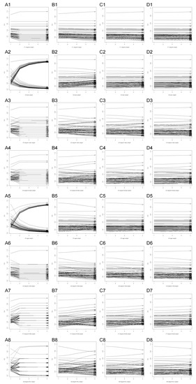 An interesting observation can be made looking at charts A1–A8. As was seen in Table 2 in Section 4.4, many vertices obtained the same score, and therefore their rank could vary. During the sensitivity analysis, this resulted in plots for multiple vertices being superimposed one on another. For example, on chart A1, only vertices 3, 4, 2, 12 and 5 can be located easily, while the remaining vertices are stacked together on the chart.