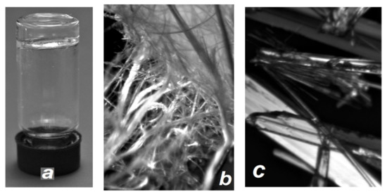 The solution from which the gel is formed is an isotropic system. The gel that appears under certain circumstances turns out to be isotropic at the macrolevel, but significantly anisotropic at the microlevel of high aspect ratio fibrils penetrating it. The final stage in the evolution of the binary system “gelator/solvent” is a crystal, which is anisotropic by definition. In principle, the question of the relationship between the nature of the fibril anisotropy and the crystal anisotropy remains open. Some researchers believe that “for gels, studies show that gelation is effectively a crystallization event, with growth only occurring in one dimension” [52]. Other authors believe that “there is no reason to necessary assume that there is a link between crystallization and gelation” [8].