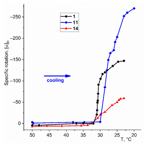 Changes in the specific rotation of transparent solutions of diol (S)-1, (S)-11 and (S)-14 (c 0.078, 0.22 and 0.12 g/100 mL, correspondently) with decreasing temperature. Explanations in the text.