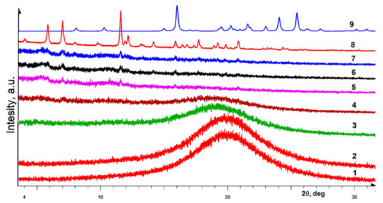 Figure 4 illustrates the transformation of gel based on 3,5-dimethyl derivative (R)-14. The gels based on this compound are one of the most transparent and stable. In the early stages of drying (curves 1–3), there is no crystalline phase in the gel. Moreover, its appearance at the final stages of the destruction of the gel is marked by the small size of the crystallites and a low degree of crystallinity in general. Comparison of the diffraction peaks with the experimental ones in the powder diffractogram of the enantiopure sample (curve 8) and with the powder diffraction pattern of the racemate calculated on the basis of single crystal data (curve 9) indicates that the resulting crystalline phase corresponds to the enantiopure sample. A small amount of the crystalline phase formed from a noticeable gel volume (curve 7) is a consequence of the high holding capacity of this LMWG in relation to solvent molecules.