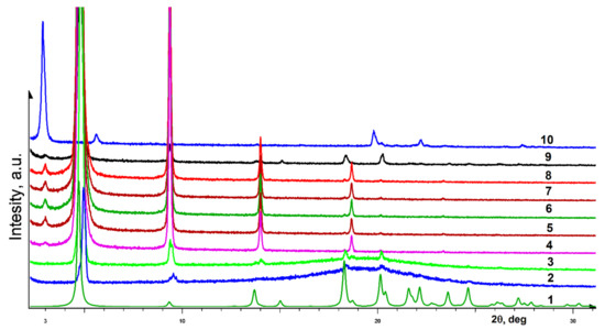 PXRD measurements were performed on an automatic Bruker D8 Advance diffractometer equipped with a Vario attachment and a Vantec linear position-sensitive detector using Cu radiation (40 kV, 40 mA) monochromated by a curved Johansson monochromator (λ CuKα1 1.5406 Å). Room-temperature data were collected in the reflection mode with a flat-plate sample. The samples in gel form were deposited on the surface of a silicon plate with minimal background scattering. Time-resolved powder diffraction patterns were recorded in the 2θ range between 1.5° and 50° in 0.008° steps with a step time of 0.1 s, the recording time for one scan was 10 min. Powdered samples were also applied without pressure to the surface of a silicon plate, diffraction patterns were obtained in the 2θ range from 1.5 to 70°, with a step of 0.008° and a set time of 0.1–1 s. The samples were spun (15 rpm) throughout the data collection. Processing of the obtained data was performed using EVA software packages [44].