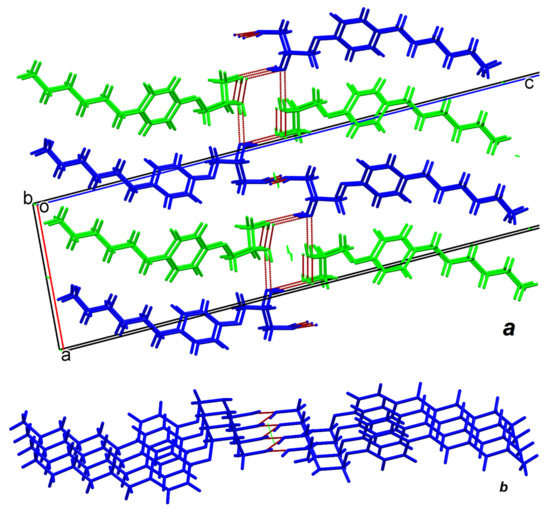 System of intermolecular hydrogen bonds in (R)-6 crystals. Symmetry independent A molecules are marked in green and B molecules in blue. Formation of 2D bilayer parallel 0ab plane (a) and almost flat zigzag chain formed by intermolecular H-bonds around screw axis 21 parallel 0b direction (b).