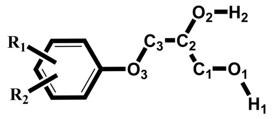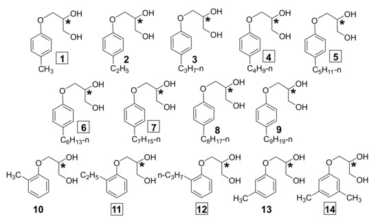All these conditions are met by the para-tolyl ether of glycerol 1, which is apparently the simplest possible chiral LMWG, which forms stable gels in alkanes in an enantiopure form and is incapable of supramolecular gelation in the form of a racemate [34]. In this work, in search of causal relationships between the nature of chiral-dependent gelation and the crystal structure of the gelling agent, we propose to compare the previously known and newly obtained data on the properties of ether 1 and the representative family of structurally related alkyl-substituted phenyl ethers of glycerol 2–14 (Scheme 1).