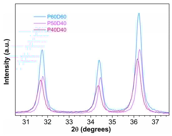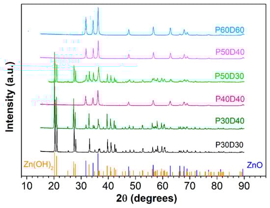 The powder X-Ray diffraction spectra of all of the samples—P30D30, P30D40, P40D40, P50D30, P50D40 and P60D60—were first visually compared (Figure 1) and then analyzed with Rietveld refinement using the GSAS-II software [56]. P40D40, P50D40 and P60D60 proved to be composed of pure ZnO, and the difference of the structural parameters was investigated, whereas P30D30, P30D40, and P50D30, on the contrary, turned out to contain both the target product (ZnO) and the precursor Zn(OH)2. For this reason, the relative composition of the two solid phases in the mixture was assessed in addition to the structural parameters. The preliminary qualitative comparison of the spectra pointed out that in P60D60, P50D40, and P40D40—the peak positions are similar; the only notable difference being their intensity, which was highest for P60D60 and comparable in the other two systems. A common crystal structure can therefore be envisaged for them. A more accurate analysis, though (see Figure 2), shows that the most intense peaks from P60D60 fall almost in the middle between the P40D40 peaks (lower angle) and P50D40 ones (higher angle). The latter two sets of peaks are shifted by 0.1 degrees, on average.