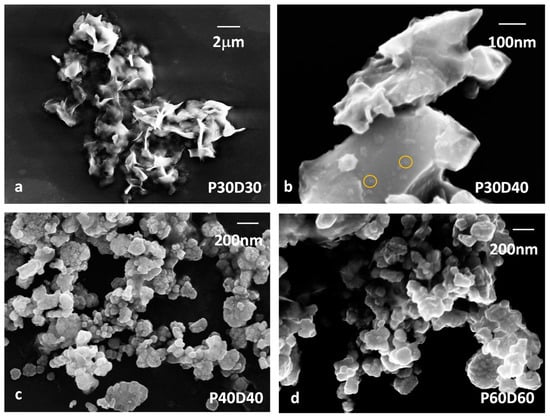 The synthesized samples display different types of morphology, depending on the temperature adopted in the different phases of the synthesis. Examples of the morphology of the samples are reported in Figure 3. The P30D30 sample, mostly composed of Zn(OH)2, has a micrometric structure of aggregated foils. In the P30D40 sample, the micrometric arrangements become more compact to form blocks, and some nanoparticles appear on their surface, as is highlighted in Figure 3b with light orange circles. Once pure ZnO is formed, i.e., when both the reaction and drying temperatures are, at least, 40 °C, the samples are characterized by the shear presence of nanoparticles. The nanoparticle morphology of ZnO is retained for higher synthesis temperatures, though the average size is slightly larger. In particular, the average size of the P40D40, P50D40 and P60D60 are 53 ± 10 nm, 65 ± 12 nm and 69 ± 11 nm, respectively, and are thus in agreement with the crystallite size detected by XRD within the experimental error (Table 2 and Table 3). In addition, there is a good agreement between the estimated crystallite size and the samples’ morphologies for mixed Zn(OH)2/ZnO samples with larger average sizes associated to Zn(OH)2 as compared to ZnO. XRD allows a separate assessment of the average size of each phase. Though this is not possible by SEM imagining, as the morphology cannot quite distinguish the crystallographic phase, it can be hypothesized that the small nanoparticles on the surface of the blocks in the P30D40 sample are actually ZnO deriving from the Zn(OH)2 dehydration.