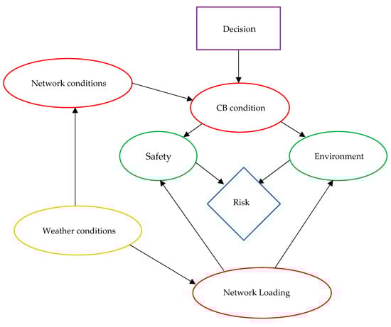 A complete model of the risk assessment of the circuit breaker maintenance strategy considered in this paper is represented in Figure 2. The graphical symbols in Figure 2 indicate the following: an orange ellipse shows an external influence, i.e., an exogenous variable, the value of which is not conditioned by previous decisions; red and green ellipses denote chance nodes described by random variables defined by discrete probability distributions. The decision is represented by a purple rectangle. Endogenous variables determined as functions of decision and other variables are represented by intermediate variables. The blue diamond represents the subject of optimization and is classified as a quantitative criterion. Influence between variables is described by an arrow.