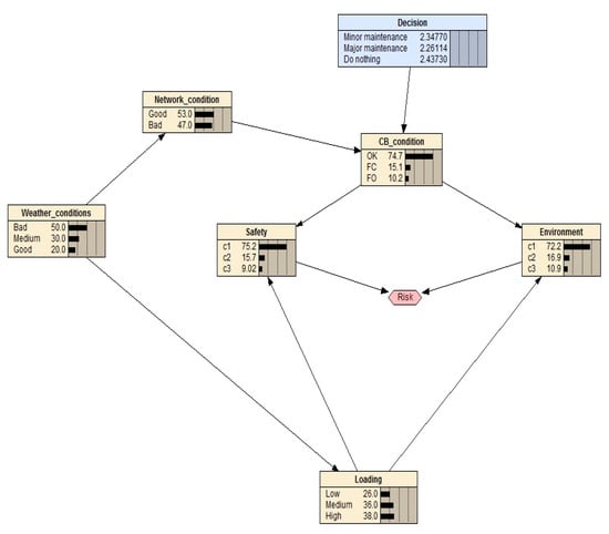 The example shown in Figure 2 was created to assess the risk of a substation with low-oil circuit breakers. The three alternatives that are considered and used for decision-making are do nothing, perform minor interventions, or perform major interventions. Safety and environment are two risk assessment criteria based on which alternatives are assessed. Both criteria are aggregated in the one influence diagram value node, after being assessed according to their risk.