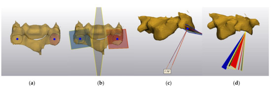 Determination and representation of tropism. (a) A C4 vertebra with the facets outlined and the centre of the facets indicated by blue dots. (b) A plane fitted to each facet and a mirror plane that was placed perpendicular to, and through the midpoint of, a line through the centre of the facets. (c) The extent and orientation of tropism for one participant. A line drawn perpendicular to the plane of each facet passing through the centre of the left facet indicates the orientation of each facet. The angle between the line perpendicular to the left facet and the line perpendicular to the mirror image of the right facet was taken to be the tropism. (d) The angle and orientation of tropism for ten participants. Supplementary files that show angle and orientation of tropism for ten participants for each vertebra are included as Supplementary 3DPDF files (Figure S1).