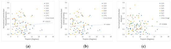Relationships between angular movement and tropism. Panels (a–c) show the relationships of tropism with normalised angular movement for each intervertebral level in flexion/extension, lateral bending, and rotation, respectively. The trendline and R2 value are for all levels combined.