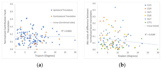 Relationships between facet movement and tropism. (a) The relationship of tropism with normalised facet translation for the ipsilateral and contralateral facets. (b) The relationship with the asymmetry of normalised facet translation (ipsilateral minus contralateral sides). The trend line and R2 value are for both sides and all levels combined.