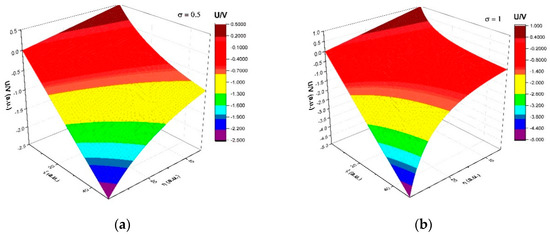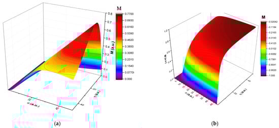 Let it be admitted in what follows that the complex system dynamics are described through non-uniform flow regimes of a multifractal fluid (i.e., )—see Figure 1 for the 3D dependencies of the velocities, both at differentiable scale resolution (11) and at non-differentiable scale resolution (13). Now, the concurrence of the dynamics of these scale resolutions is obtained by eliminating the quadratic term in between (11) and (13), taking the form of the normalized velocity ratio: