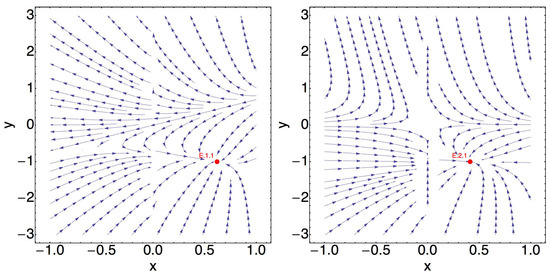 where . Similar to the other two models considered in this subsection, solution can describe the state of the universe where interacting varying Chaplygin gas, Equation (9), is either a phantom dark energy or a quintessence dark energy. In particular, the constraints on the model parameters presented in Table 9 describe the universe where the varying Chaplygin gas, Equation (9), is a phantom dark energy. It should be mentioned that is physically not reasonable solution, while is a stable focus and does not describe the accelerated expansion.