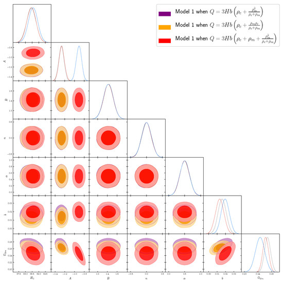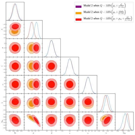 Figure 3. Contour maps of the model given by Equation (9) for . The best fit values of the model parameters have been found and presented in Table 12. In all three cases, , , , , , and flat priors have been imposed during the generative process used to generate the “observational” data. The analysis is based on 10 chains and, in each chain, 10,000 “observational” data-sets from the model have been generated.