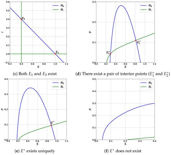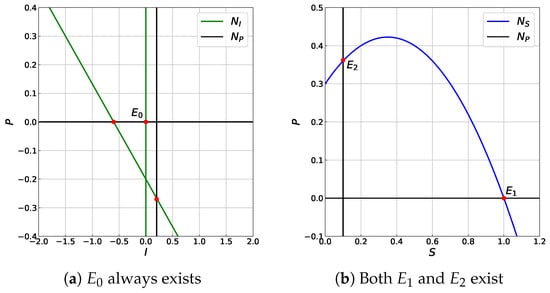 Since , then is the only nullcline of I. By substituting to , we have . is the only nullcline of P because . Thus, is the only equilibrium point. □