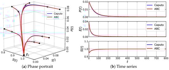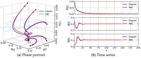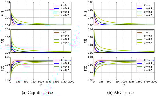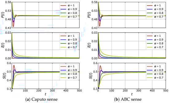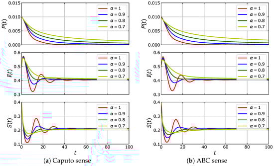We note that model (5) consists of three fractional differential equations. The order of the fractional derivative in all equations is set to be the same to maintain their symmetrical aspect.