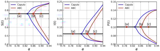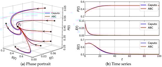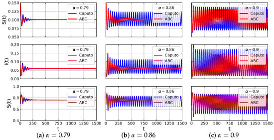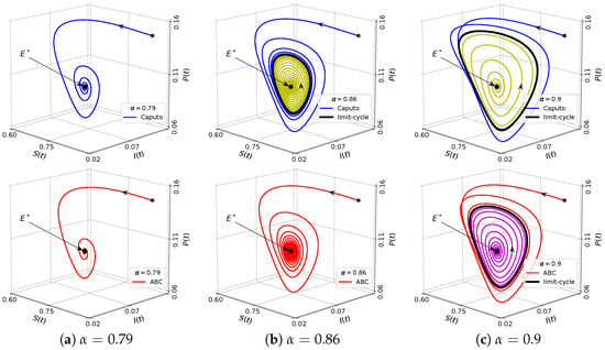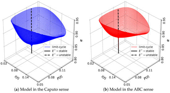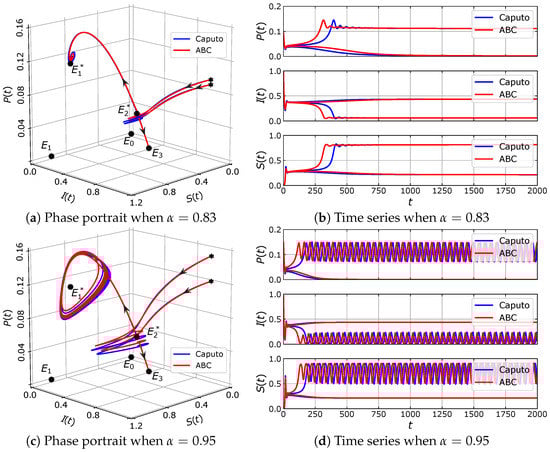 For this case, the model has five equilibrium points, namely , , , and . Using the results of a previous stability analysis, it is shown that , and are unstable, while is asymptotically stable regardless of the value of . We also check that there exists Hopf bifurcation around . In the latter case, is stable for . If then loses its stability and there appears a limit-cycle. Hence, the model exhibits a bistability phenomenon for , where, in this case, and are locally asymptotically stable. To illustrate the dynamics of eco-epidemic model with parameter values in (33), we plot numerical solutions with two slightly different initial values in Figure 12. When we take the solutions of both models are respectively convergent to different equilibrium points, namely and , see Figure 12a,b. Furthermore, when we increase the order of fractional derivative to then remains stable but the stability of vanishes via Hopf bifurcation as in Figure 12c,d. Thus, a captivating circumstance has been shown, where the initial condition is very sensitive in determining the limiting behavior of the system.