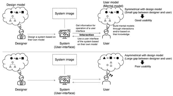 The model proposed by Norman [7] can be used as a reference to consider usability and error prevention in device operation from the perspective of mental models. That model comprises three aspects, i.e., user model, design model, and system image. The user model is formed by a user through interaction with a system. The design model is developed by the system designer, and the system image is the working principle of an actual system. The interface between a system and a user is based on the design model; thus, the symmetry between the user model and the design model is important to improve usability and prevent errors. When there is symmetry between the user model and the design model, i.e., the degree of agreement between models is high, users can operate the system following their individual user model and achieve high performance. However, if the user model is asymmetrical to the design model, the user cannot operate the system correctly, which may cause errors. The relationship between the design model and the user model is summarized in Figure 1.