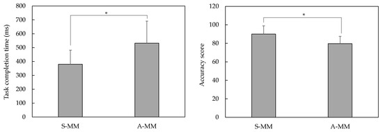 The task completion time and accuracy scores of each group are shown in Figure 2. t-test results confirmed the differences in task completion time and accuracy scores between the two groups. The results show that there was a significant difference in both task completion time and accuracy score of the operation (task completion time: |t(22)| = 2.81, p = 0.01, accuracy score: |t(22)| = 2.66, p = 0.02). The S-MM group showed a shorter task completion time and higher accuracy scores than the A-MM group.