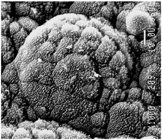 Lithium samples were formed after plasma irradiation in the T-10 tokamak and PLM plasma device [13,14]. The lithium samples as layers of 0.5–2 mm thickness are formed on in-vessel components of the T-10 tokamak after experimental campaign described in [13,15]. In these experiments, the liquid lithium of capillary porous system evaporated under a powerful plasma load in plasma discharges. The evaporated materials redeposited on the surface. The reactivity of lithium with oxygen and carbon in plasma resulted in deposited materials with hierarchical granularity, see [13,14]. These lithium samples were subsequently irradiated with plasma in the PLM plasma device, see [13,14]. Under the steady-state plasma load of 200 min in PLM, surface structures with hierarchical granularity were grown on scales of 0.5–500 microns [13], Figure 4. The cauliflower-like surface relief is similar to the morphology of hydrocarbon deposits observed recently in plasma devices tokamaks [11,12,16].