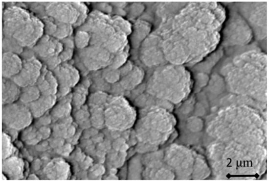 In materials irradiated with plasma in fusion devices, a granularity is observed from nanoscales to macroscales (see Figure 9 and Figure 10). It is known that nanoscale structural elements (for example, nanocrystallites) in a nonequilibrium process in a disordered solid, due to their mobility and adaptability, provide scale invariance of the distribution of stress fields at the microscopic and mesoscopic levels. In thin films, under extreme conditions, scale invariance of the structure is observed [1,2,19].