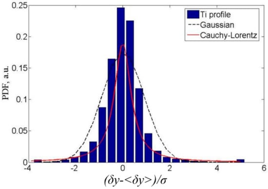 PDF of the profile heights (Figure 10) of carbon surface after irradiation with plasma in Figure 10. tokamak. Surface height increments δy = y(x + l) − y(x), l = 19.5 nm are analyzed. The Gaussian (dotted line) and the Cauchy–Lorentz (red dashed line) distributions are shown for the comparison.