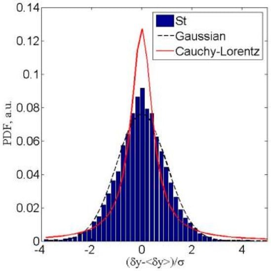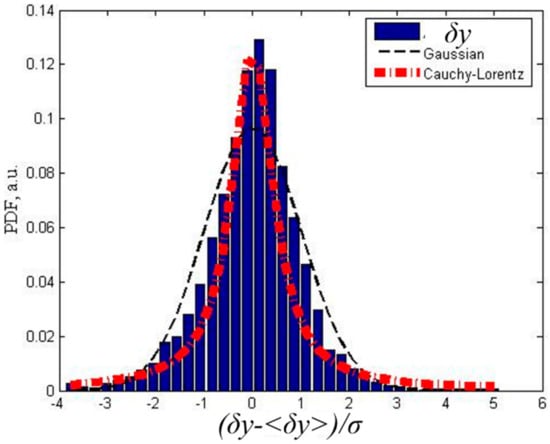 PDF of the profile heights of industrial steel casting surface after solidification. Surface height increments δy = y(x + l) − y(x), l = 0.5 μm are analyzed. The Gaussian (dotted line) and the Cauchy–Lorentz (solid line) distributions are shown for the comparison.