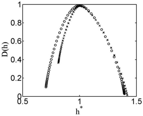 The multifractal spectrum D(h) versus the normalized Hölder exponent centered at 1, h* is the value at the maximum h* = 1 + (h − hDmax). The spectra demonstrate similarity for two carbon samples from the T–10 tokamak (circles, crosses).