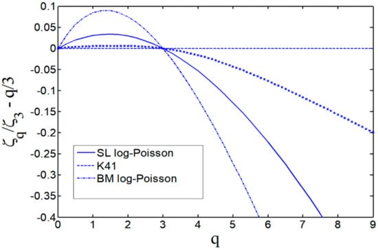Scaling ζq of structure functions vs. q for the relief of the carbon sample (cf. Figure 10) irradiated with plasma in the T-10 tokamak (crosses). A dependence of ζq normalized with ζ3 and subtracted with q/3 is shown for illustration of nonlinear behavior, which is typical for objects with multifractal statistically inhomogeneous structure. For the comparison, the linear scaling q/3 predicted for simplest (trivial) self-similarity (K41—Kolmogorov’s K41 model [21]) of statistical homogeneity (dashed line), log-Poisson scaling of models SL and BM, see [20], of a cascade process (solid line and point-dashed line) are shown.