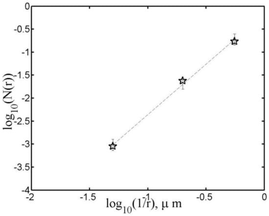 Estimation of fractal dimension by the box–counting method. Carbon material irradiated with plasma in the T-10 tokamak (stars). Fitting with power law N(r) ~ r-df is shown by a dashed line, estimated fractal dimension df = 2.19.