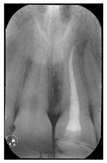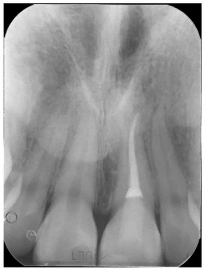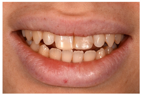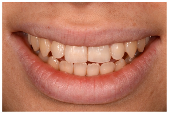 A healthy 21-year-old woman referred to the dental office for the esthetic rehabilitation of both central maxillary incisors. The patient had a good oral status, with full mouth plaque score (FMPS) and full mouth bleeding score (FMBS) equal to 0 and 1, respectively. After clinical examination (Figure 1), both restorations resulted in being incongruous in shape and color. Radiographic examination (Figure 2) revealed a satisfactory endodontic treatment. The translucent areas around the interface suggested a poor internal adaptation of the restorative material.