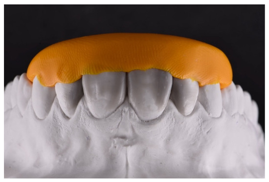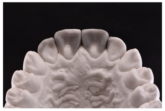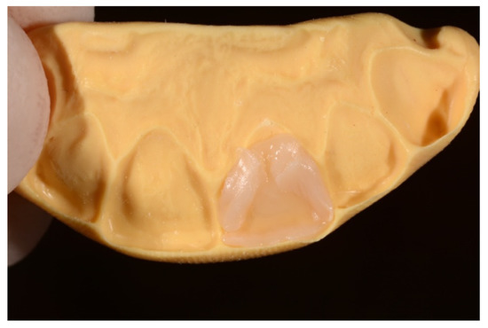 On the diagnostic wax-up, a palatal silicone index (Elite HD+, Zhermack, Badia Polesine, Italy) was created with a canine-to-canine extension (Figure 6). The palatal silicon index was modified with a scalpel in order to remove buccal portions and in order to have a passive fit during restorative procedures.