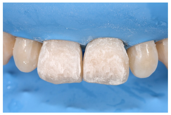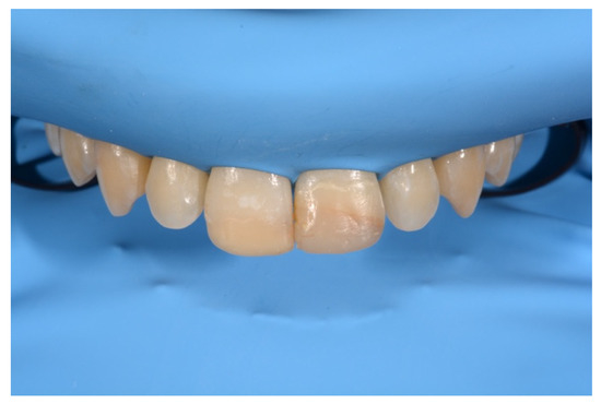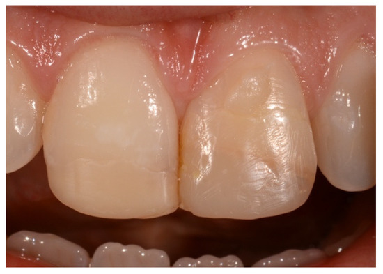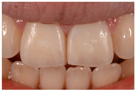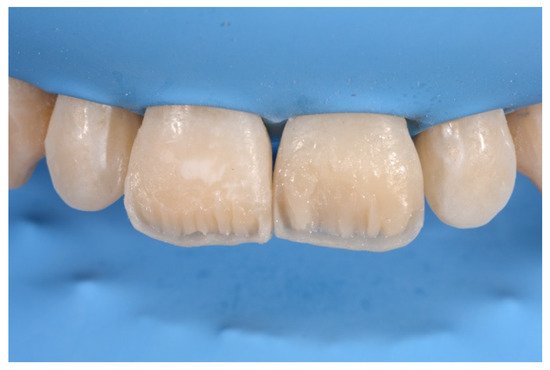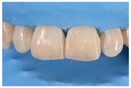 The superficial enamel layer was then applied on both incisors and excess removed with the “OUT” tip of the abovementioned caliper. In order to provide both incisors with a symmetrical aspect, an opaque white staining material (Kolor + Plus, Kerr, Bioggio, Switzerland) was applied on the buccal aspect of the left central incisor in order to replicate the white spot present on the right central incisor (Figure 20).