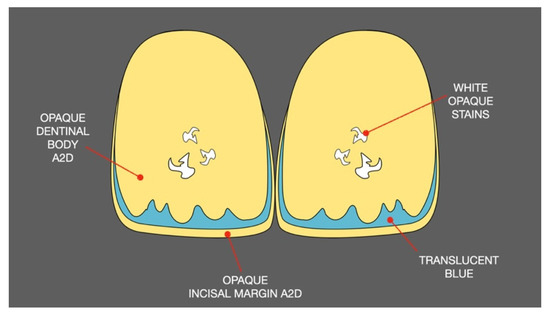 Once the frame (palatal, incisal and interproximal) is completed, it is possible to add internal dentinal shades according to the initial color chart [30]. Internal anatomy influences esthetic outcomes of a multi-layered restoration [31]. The choice of correct opaque and translucent shades can provide a natural aspect to the restoration and should be carefully performed. In the coronoapical direction, the incisal third of anterior maxillary teeth is generally characterized by a thin opaque incisal shade, then by a translucent area and then by the opaque dentinal body, often characterized by mamelons. Commercially available shades generally suggest enamel and dentin to be used with an anatomical criterion, but they are often used to reproduce more opaque areas (with dentinal shades) and more translucent ones (with enamel shades) [12,22,23,24,31,32].