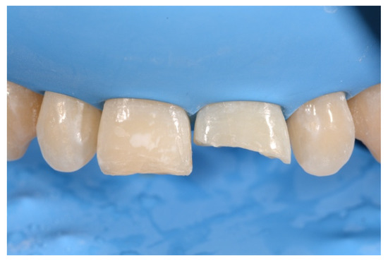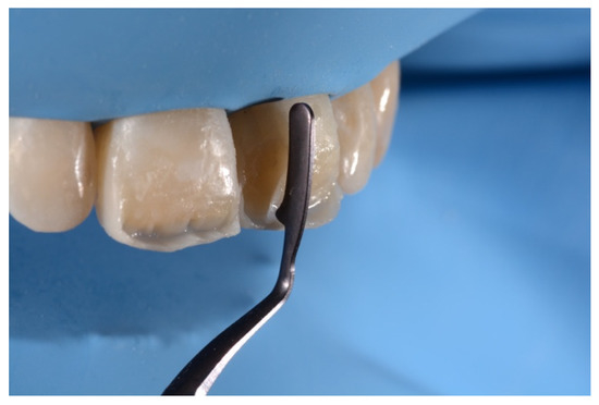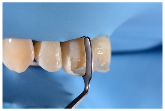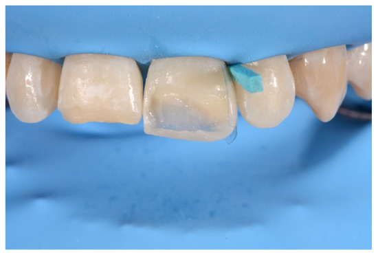 The silicone index, with the uncured composite (Clearfil Majesty ES-2 A2E, A2D, Kuraray Noritake Dental, Tokyo, Japan), was positioned in the mouth of the patient. The composite was cured from buccal and incisal area for 20″. The silicone index was then gently removed, and another 20″ light curing was performed from the palatal side. Distal and mesial walls were restored with the help of transparent convex mylar strips (Hawe Adapt, Kerr, Bioggio, Switzerland) and a wooden wedge (Sycamore, Kerr, Bioggio, Switzerland) (Figure 15 and Figure 16).