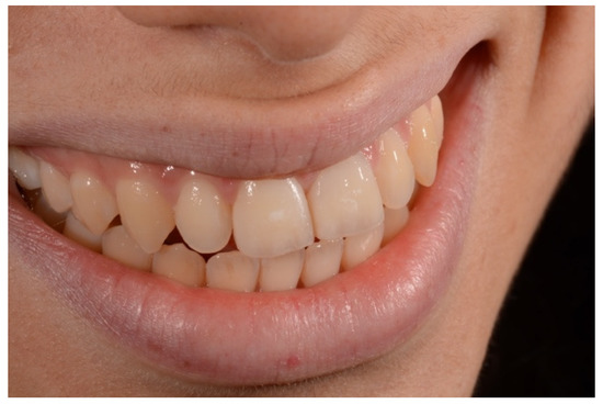 Because of the young age of the patient, a noninvasive treatment with direct restoration was proposed. As suggested by several authors, because of the quantity of the residual sound tissue, no post was planned for the left central incisor [10,11]. After having analyzed the smile-line of the patient (Figure 3), silicone impressions were taken with a polyether material (Impregum Penta + Permadyne Penta L, 3M Espe; St. Paul, MN, USA) in order to develop a diagnostic wax-up (Figure 4 and Figure 5) [12].