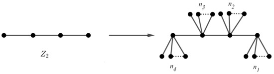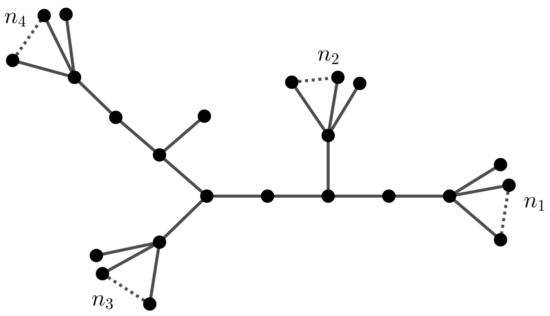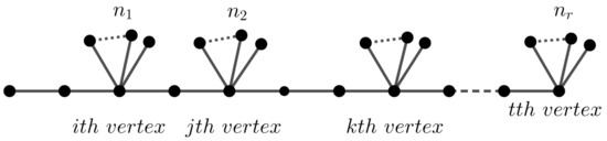 It is not difficult to prove that . Following this method, suppose is a sequence of distinct arbitrary integers, where . Then, the caterpillar graph has orbits of sizes and in which . If some of the ’s are the same, then the structure of is more complicated. The caterpillar graph G in Figure 4 has singleton orbits, and the other orbits are of sizes , while the underlying graph is the path graph with automorphism group . Following this method, suppose G is a graph with an identity automorphism group. Add pendant edges to each vertex of G. The automorphism group of the resulting graph is isomorphic to group , where .
