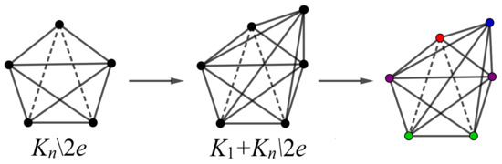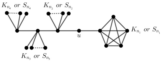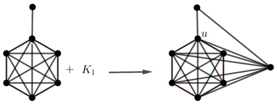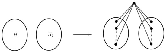 Consider the complete graph and the new graph H in Figure 14 by attaching pendant edges to graph . Then, by Theorem 2, we obtain .