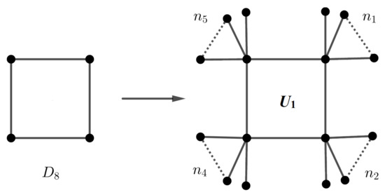 Consider a graph G as depicted in Figure 5. Attach pendent vertices to each leaf of G; see Figure 6. The orbit sizes of the new graph are , , and . Consider the graph H in Figure 7. The orbit size sequence of H is . If we remove the vertex u from H and join its neighbors by an edge, then the resulting graph has four non-singleton orbits of sizes , and . In general, choose a graph of order r with the identity symmetric group, and each vertex coincides to either or . Then, the resulting graph has orbits of sizes . Moreover, the automorphism group of the resulting graph is isomorphic to . For example, the cycle graph in Figure 8 is vertex-transitive with dihedral automorphism group . Attach , and (all of them are distinct) pendent edges to each vertex. Then, the graph has four non-singleton orbits and four singleton orbits. Hence, the orbit polynomial is . Two graphs and in Figure 8 and Figure 9 have the same orbit polynomial.