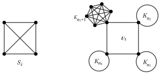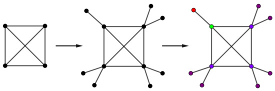 Let be a complete graph on vertices. Put pendent edge into vertices of and pendent edges on the other vertices ( vertices); see Figure 13. Then, the resulting graph has four orbits of sizes , , , .