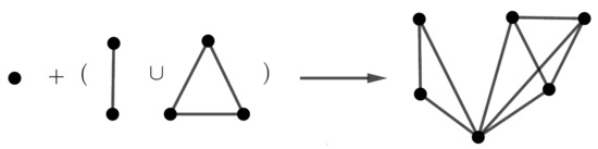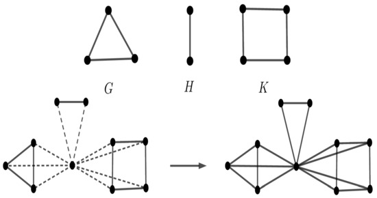 Suppose and K are three vertex-transitive graphs of orders , and , respectively, (distinct); see Figure 12. Then, the graph has four orbits of sizes , and . In general, , where has four orbits of sizes , and .