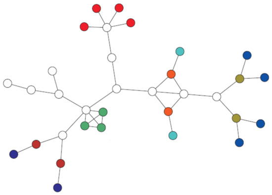Actually, the order of the maximal orbit in the graphs , , , and , is 4, 5, 2, 2, 1, respectively. We say a measure is degenerate if it fails to distinguish between two graphs that are not isomorphic [29,30]. Our results showed that, as the value of the unique positive roots in Table 1 decreased, the order of the automorphism groups also decreased, but this is not true in general. Continuing, a set of well-known real-world networks with distinct topologies were collected, and analyzing the reported data showed that the symmetry measure was not highly correlated with the size of the automorphism group; see Table 1. Furthermore, in [2,31], it was shown that was a degenerate measure for sorting distinct graphs with the same vertex-orbits. Finally, in [2], six classes of trees of orders 15–19 were chosen, and the results indicated a weak correlation between and S.