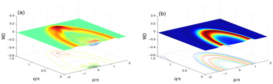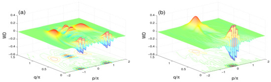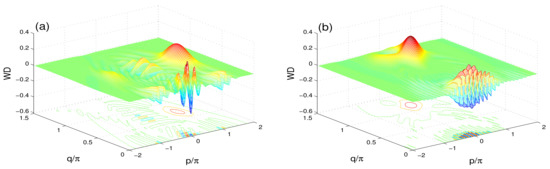 In Figure 2, the Wigner distribution is shown in the region and for two different normalized times, in (a), at which the qubit–cavity state is in a maximally entangled state, and in (b), which corresponds to a partial entanglement. We note that the qubit–cavity interaction leads to notable changes in the distribution of the positive and the negative regions of the WD. The distribution amplitudes of the symmetrical interference peaks and bottoms depend on the considered time . For the case , the main interference peaks and bottoms are around . While for the case , the centers of the main interference peaks and bottoms are at the axis .