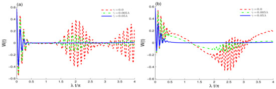 The decoherence and the dissipation effects on the WD nonclassicality were investigated in [53,54]. These studies were limited [55,56,57]. The WD non-classicality was explored for a cavity QED containing a high optical nonlinear medium and a quantum well [55], for weak dissipation rates. In [56], the effect of intrinsic decoherence on the WD dynamics of a cavity interacting resonantly with two coupled qubits was investigated. Under the phase-cavity-damping effect, the WD nonclassicality of a cavity field interacting with a qubit with a specific value of applied magnetic flux (half of the applied flux quantum) was studied [57].
