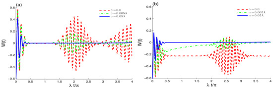 In Figure 5b, the dynamics of the largest positive value of the WD is shown for the off-resonance case . We note that the detuning between the charge–qubit and the coherent cavity field enhances the oscillation frequency and the non-classicality of the WD. We also observe collapse intervals of the WD (). In addition, the detuning accelerates the effect of the dissipation, i.e., it accelerates the erasing of the classical and quantum information of the WD. The non-classicality dynamics of the for the fixed point in the phase space , which corresponds to the largest negative-value for the initial WD is displayed in Figure 6a. For the resonance case , we have the same behavior as the previous case of Figure 5a. While for the off-resonance case , we observe that the detuning leads to a downshift in the average of the Wigner distribution, from to . This means that the detuning increases the non-classicality of the Wigner distribution, and accelerates the erasing of the its classical and quantum information due to the dissipation.